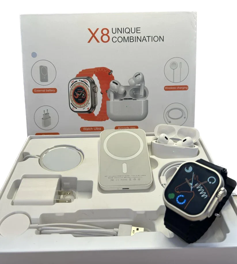 Paquete Inteligente X8 – Color negro: Lleva la tecnología a tu muñeca y a tu vida diaria con el Paquete Inteligente X8 4 en 1. Incluye el Ultra Smartwatch 8 Max con funciones de monitoreo de salud y notificaciones, auriculares Pro 2da Gen para una experiencia auditiva premium, powerbank magnético inalámbrico y cargador magnético con cable. Todo lo que necesitas, en un solo paquete.